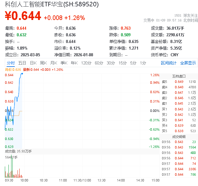 热门ETF方面,科创人工智能ETF华宝(589520)场内价格上涨1.1%,成交额达2246.05万元。