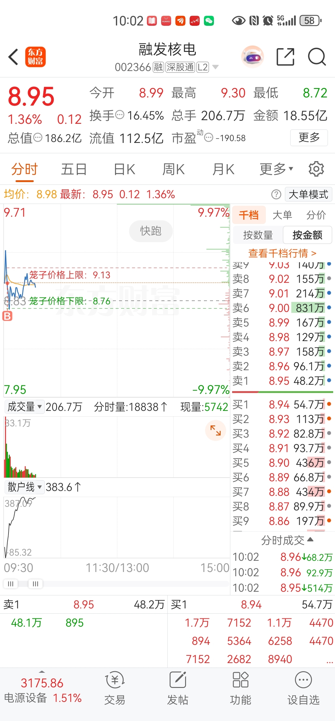 再看今早的盘口细节,融发核电开盘冲高到9.30元后快速跳水,最低砸到8.72元,看似是资金出逃,实则是主力的洗盘动作。跳水过程中成交量并没有放大,说明筹码没有松动,只是散户恐慌性抛盘。我盯着千档行情,看到8.70元附近有大资金持续挂单承接,这就是明确的低吸信号,果断在低位建仓。果不其然,承接出现后股价迅速震荡拉升,分时图走出V型反转,截至10点,股价已经回到8.95元,换手率16.45%,刚好达到充分换手的水平,为后续拉升扫清了浮筹。
