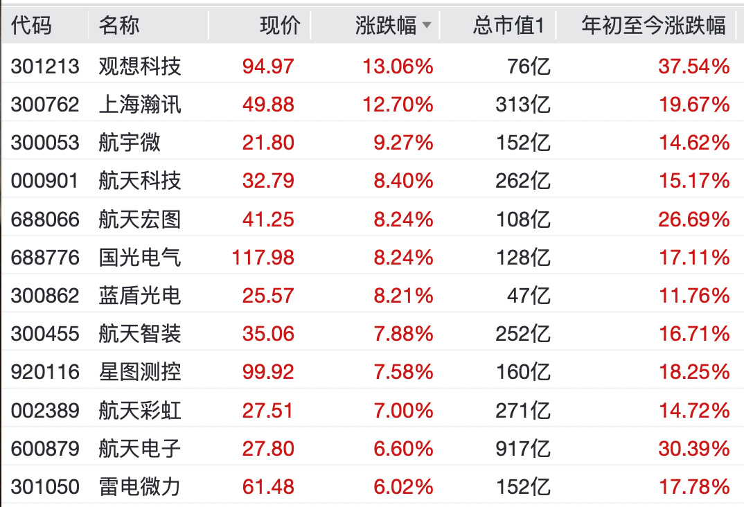 个股方面,观想科技涨超13%,上海瀚讯大涨超12%,航天电子、中国卫星、金风科技、航天智装、星图测控、航宇微、航天宏图、雷电微力、航天彩虹、蓝盾光电等涨幅居前。