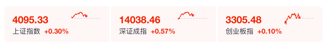 截至午间收盘,沪指报4095.33点,涨0.3%,深证成指涨0.57%,创业板指涨0.1%。
