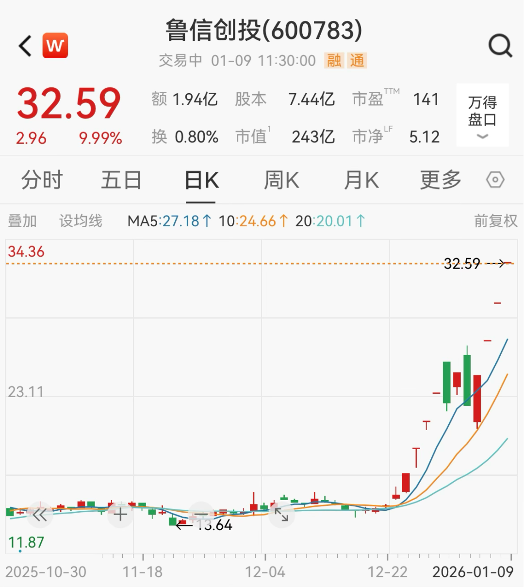 鲁信创投走出11天9板,现报32.59元/股,最新市值为243亿元。