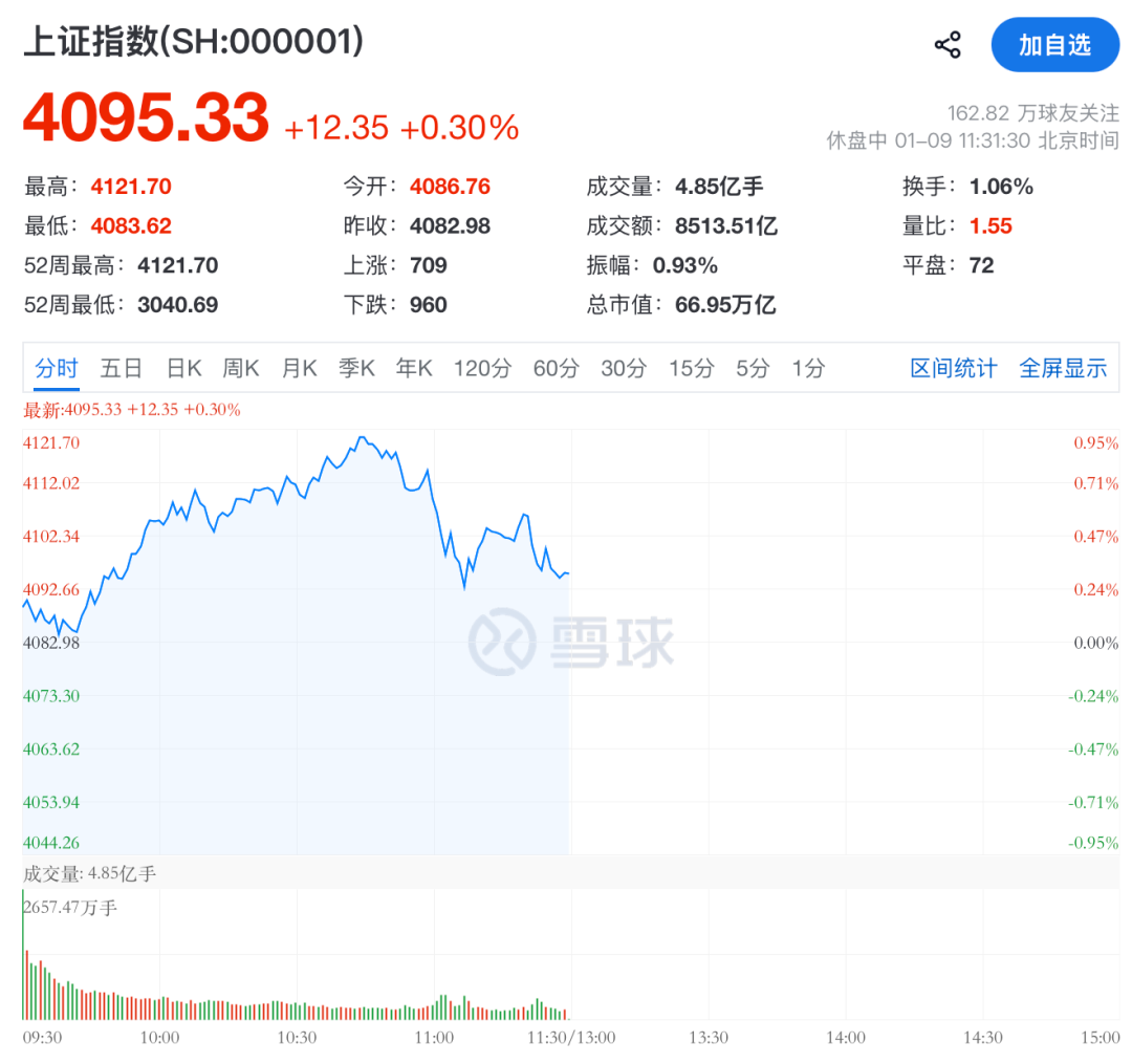 1月9日上午,A股三大股指集体上涨,沪指时隔十年再度站上4100点,半日成交额超2万亿元。