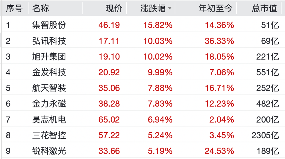 个股方面,旭升集团、弘讯科技、金发科技录得10cm涨停,集智股份涨超15%,昊志机电涨超10%,金力永磁、锐科激光、伟创电气涨幅居前。