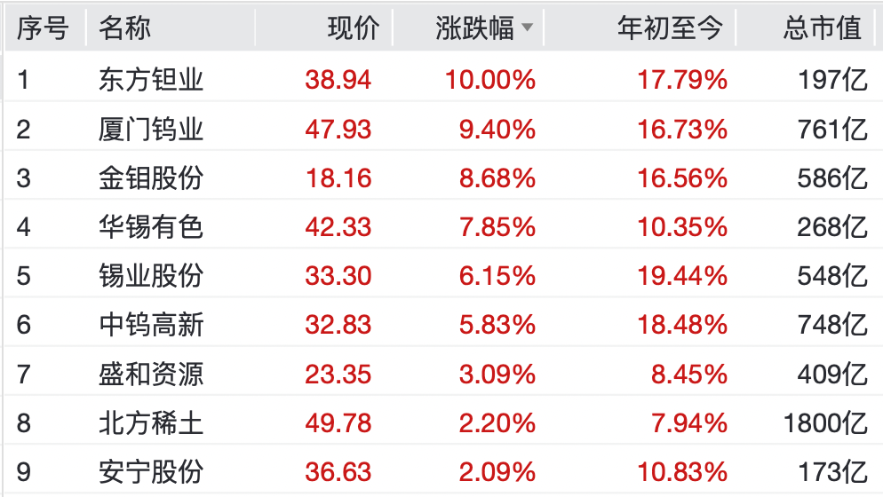 东方钽业录得10cm涨停,金钼股份、华锡有色、中钨高新涨超6%,锡业股份、盛和资源、北方稀土等纷纷上涨。