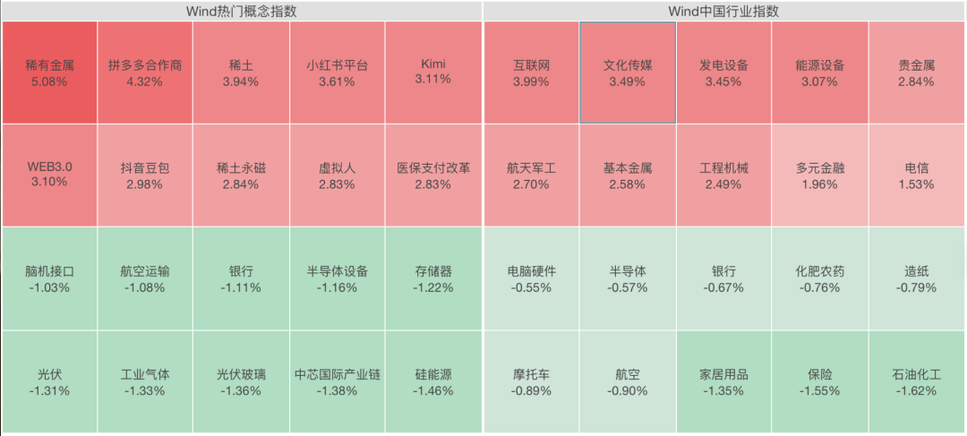 从板块看,航天军工、人形机器人、有色金属、文化传媒、贵金属等板块涨幅居前;化纤行业、光伏设备等板块下挫,大金融再度走低,银行保险等板块跌幅居前。
