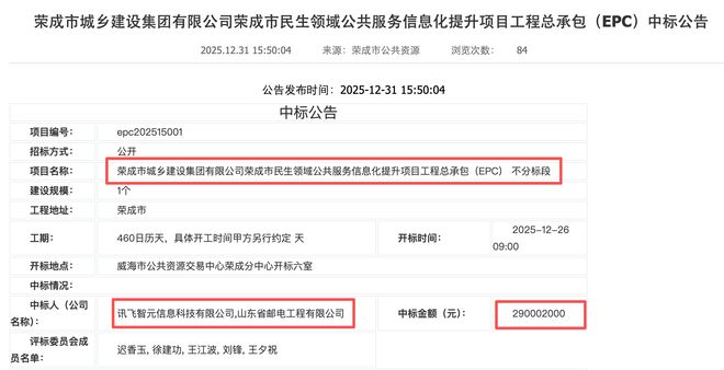 2025年12月31日,山东荣成市“民生领域公共服务信息化提升项目”公布中标结果,科大讯飞全资子公司讯飞智元与山东省邮电工程有限公司组成的联合体成功中标,项目金额高达2.9亿元。该项目计划在460天的工期内,依托人工智能大模型与大数据技术,重点对当地教育、医疗和文旅三大民生领域进行系统性数字化升级。