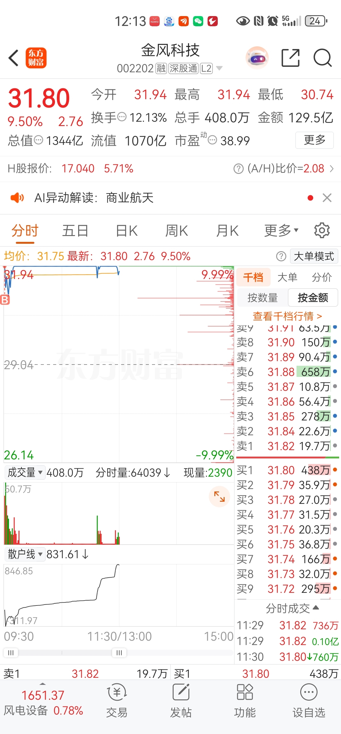 昨晚梳理消息到深夜,才摸透陈小群盯上金风科技的核心逻辑:根本不是单纯的风电主线,而是蓝箭航天IPO带火的商业航天赛道!金风科技在商业航天的风电设备配套、特种电机研发领域有相关布局,这才是游资抢筹的关键。再看集合竞价,开盘直接封死涨停,初始封单达到上亿级别,我判断跟着主线节奏有机会把握行情,便果断完成建仓。