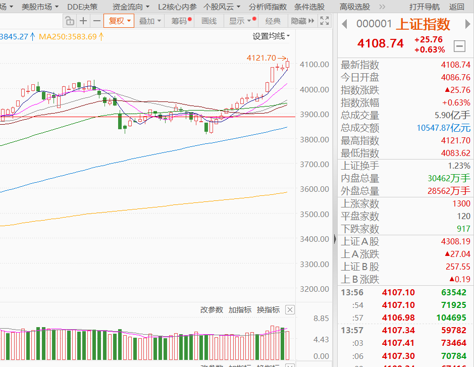 先详细拆解今日行情:早盘上证指数从4086.76点起步震荡拉升,最高触及4110.23点,成功突破2015年7月底以来的长期压制线,目前在4108.68点;深证成指涨0.85%报14078.22点,创业板指也扭转开盘后的弱势,最终涨0.22%报3309.56点。两市合计成交超2.15万亿元,能在调整后迅速放出巨量上涨,足以说明市场资金承接力极强,牛市的大趋势根本没动摇。