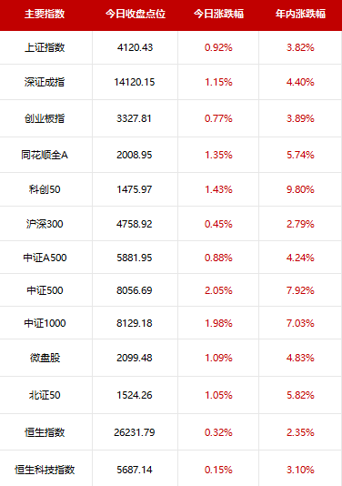 A股今日集体上涨,截至收盘,沪指涨0.92%,深成指涨1.15%,创业板指涨0.77%,北证50指数涨1.05%,全市场超3900只个股飘红,成交额31523亿,较上日放量3261亿。