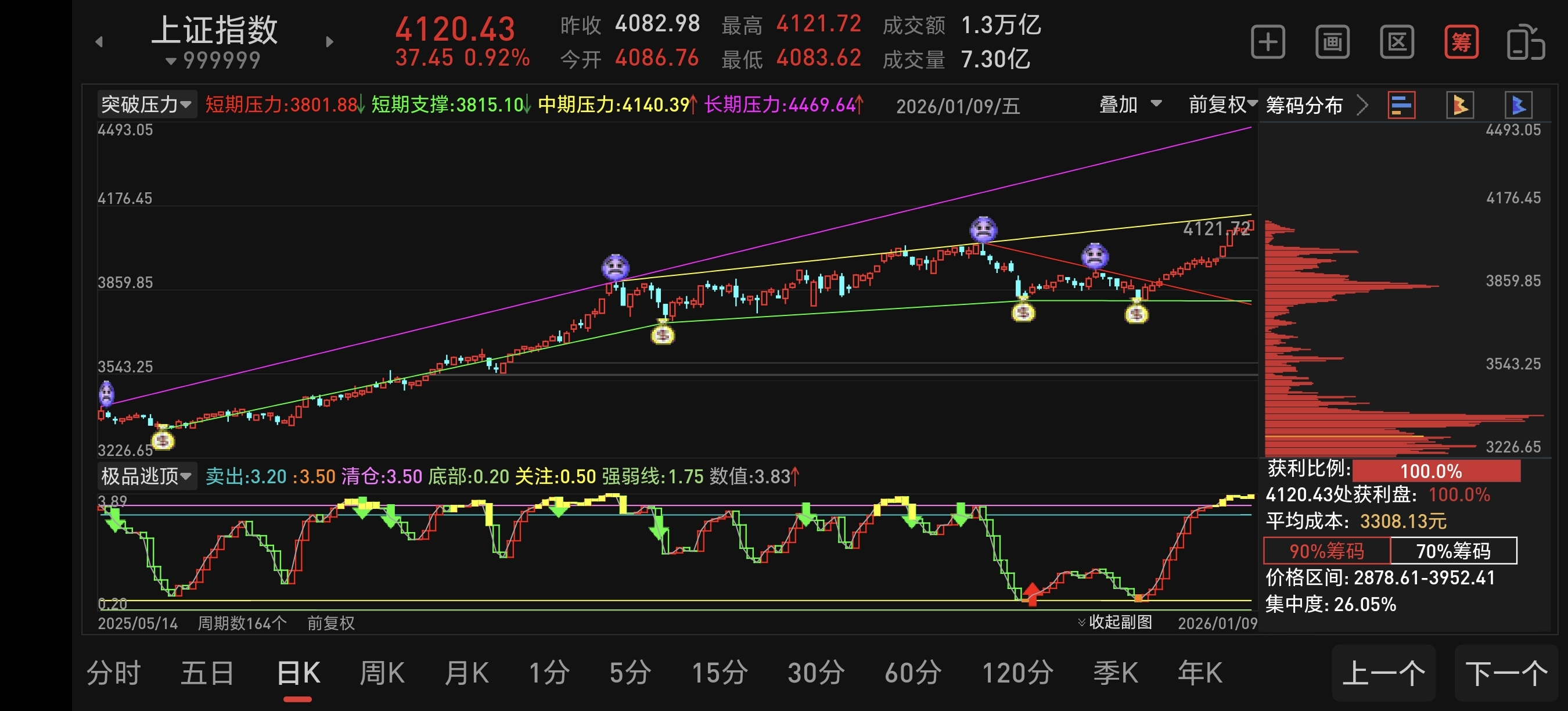 上证指数下周仍有冲击日线级别趋势线4140点预期,最多17连阳,原则上继续抱团核心趋势龙头,避免短期震荡风险。