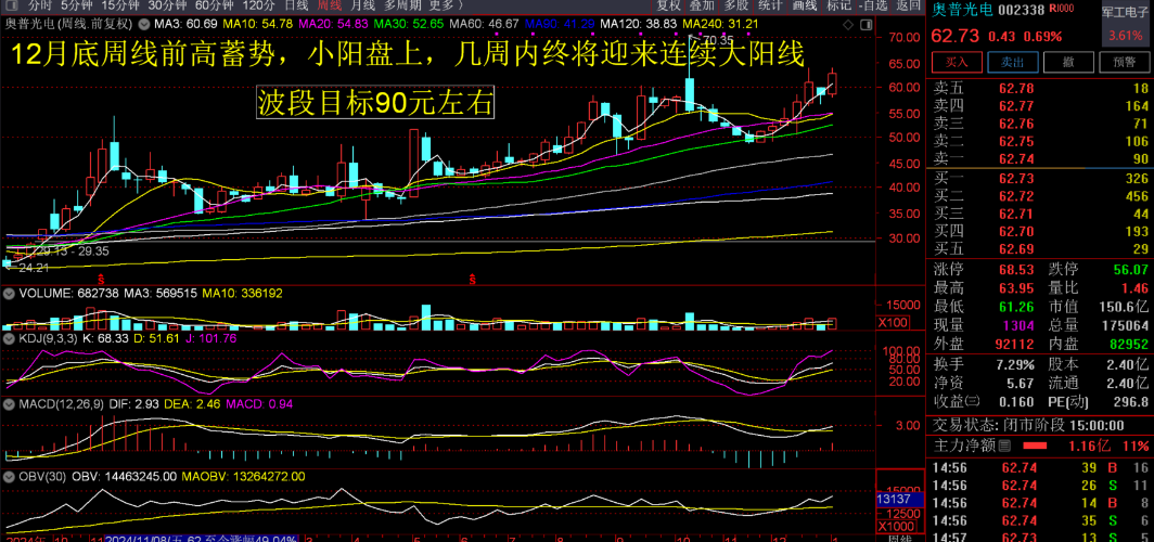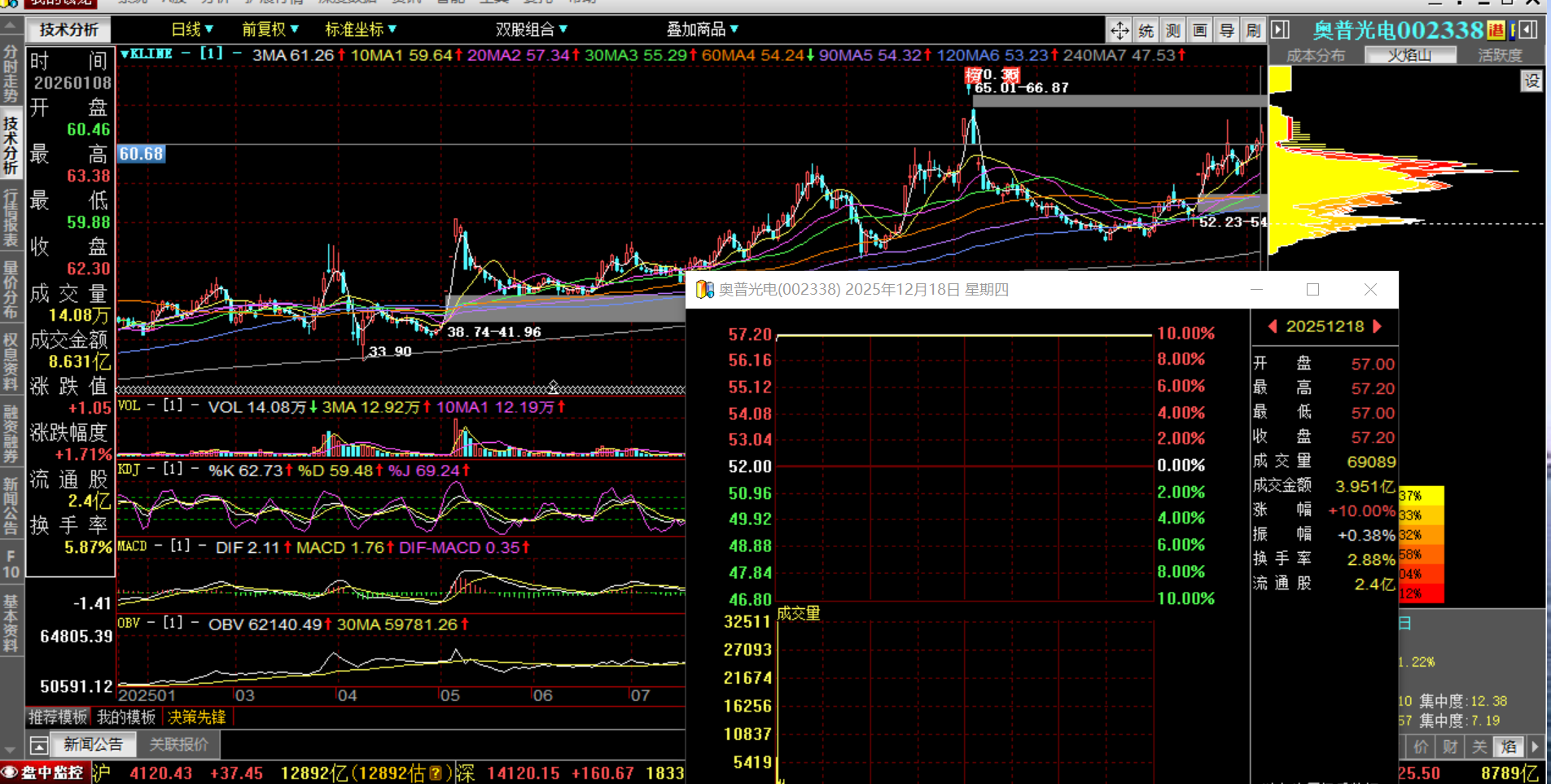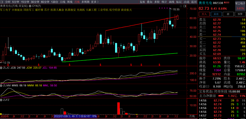 奥普光电25-12-18日,主力资金开盘瞬间拉涨停,资金一直未出局,9日已经形成日KDJ金叉,周MACD再次金叉做多趋势。