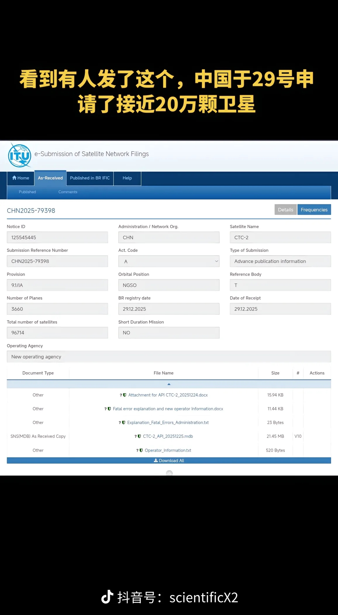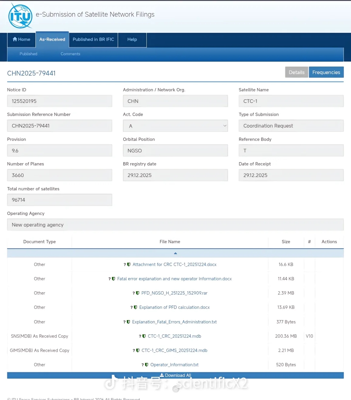 3. 申报时间:ITU接收与登记日期均为2025年12月29日,2026年1月9日相关数据正式披露。
