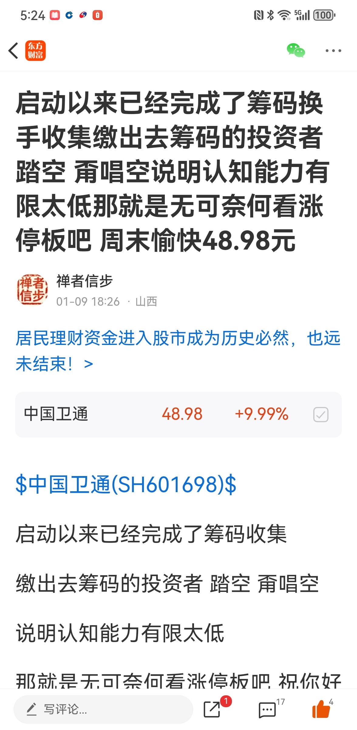 启动以来已经完成了筹码换手收集缴出去筹码的投资者 踏空 甭唱空说明认知能力有限太低那就是无可奈何看涨停板吧 周末愉快48.98元