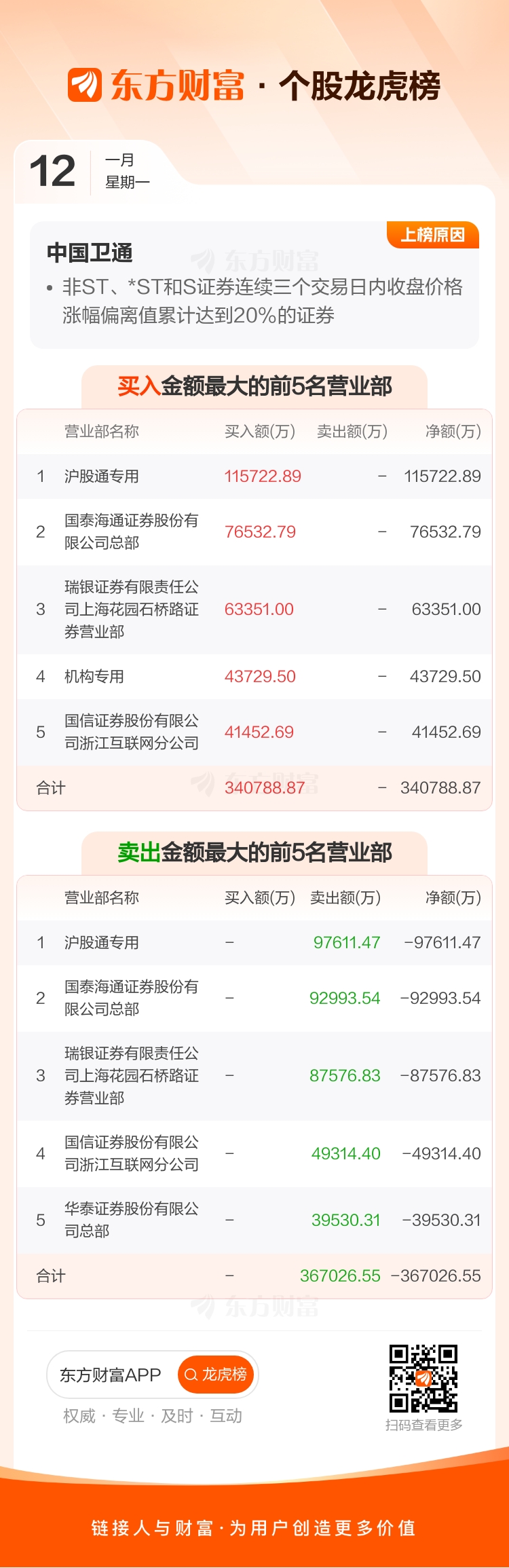 这张图片是东方财富1月12日发布的中国卫通龙虎榜,上榜原因为连续三个交易日收盘价涨幅偏离值累计达20%,核心资金动向与席位特征分析如下: