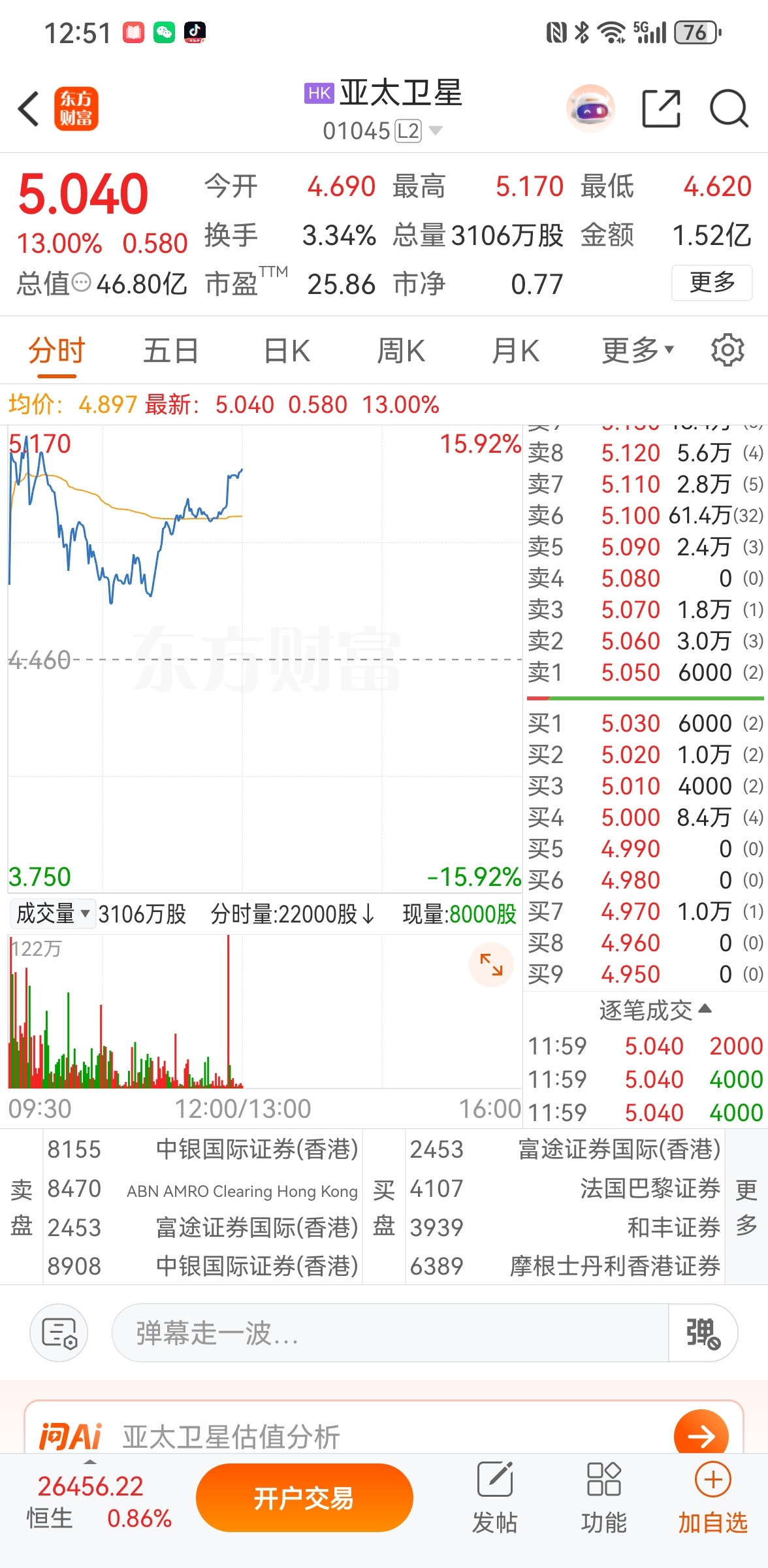截至2026年1月12日12时49分,港股亚太卫星(01045.HK)实时报价5.03港元,较前一交易日上涨0.57港元,涨幅12.78%,成交额5047万港元,成交量1006万股,港股市值46.7亿港元。