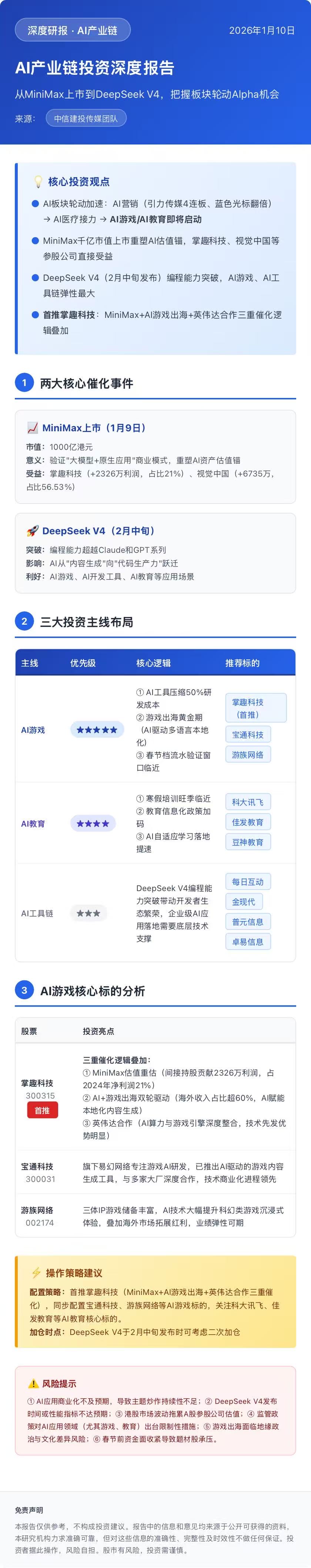 AI 不缺长期逻辑,短期赚的是“轮动 + 催化”。当前窗口,AI 游戏 > AI 教育 > AI 工具链,MiniMax 估值反馈与 DeepSeek V4 发布时间,是下一波行情的发令枪。