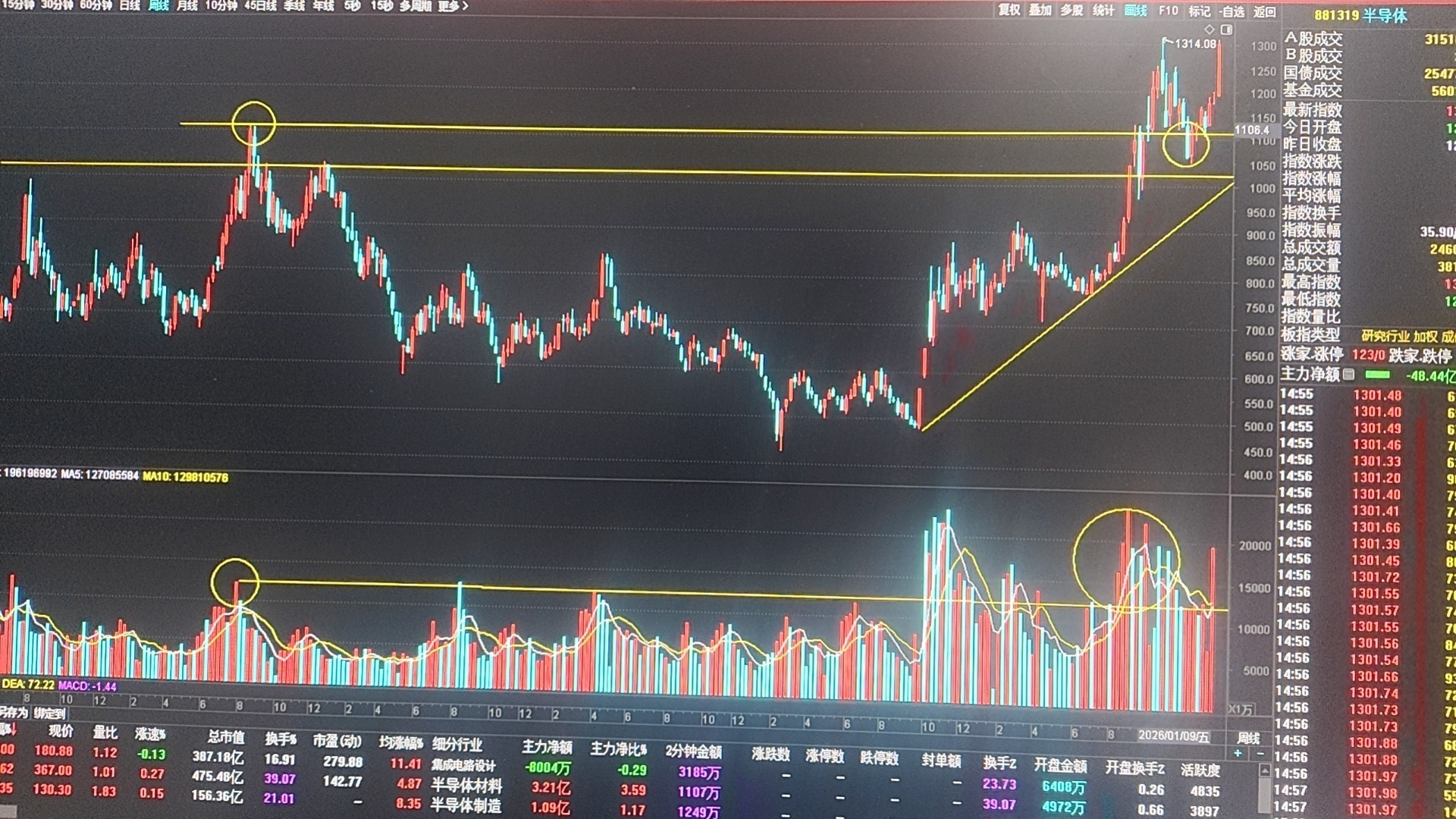 半导体周K在去年9月中旬放量突破21年8月初高点后一直在上方运行,11月下旬向下假跌破随后收回,本周收盘已经创下历史收盘新高,意味上方无套牢筹码,1100点_1200点区间筹码峰并未有明显松动,下峰不移,上涨不止!依旧看好半导体后期的表现!