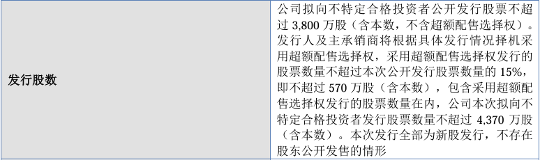2. 发行方案:公司发行前总股本10500万股,拟发行3800万股(不包含超额配售),发行后总股本14300万股(不包括超额配售)。拟募集资金 44935.53万元,拟发行价11.83元。