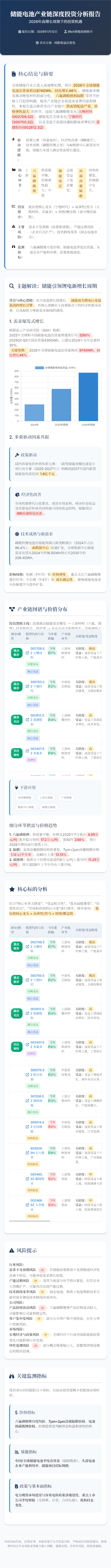 结论性判断储能电池产业链正迎来历史性发展机遇,2026年将成为行业发展的关键节点。六氟磷酸锂和高端隔膜等环节的供需错配将创造显著的投资机会。投资者应聚焦具备技术优势、产能规模和客户资源的龙头企业,把握这一轮产业变革带来的红利。