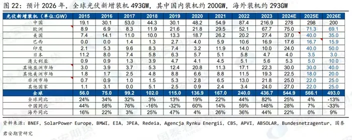 国泰君安期货曾指出,受政策调整、补贴退坡、贸易壁垒及消纳瓶颈等多重影响,全球光伏装机将结束高增长态势,转入负增长通道。同时,预计2026全球新增光伏装机493GW,同比减少13%。其中国内市场受136号文影响大幅收缩,预计2026新增装机200GW。