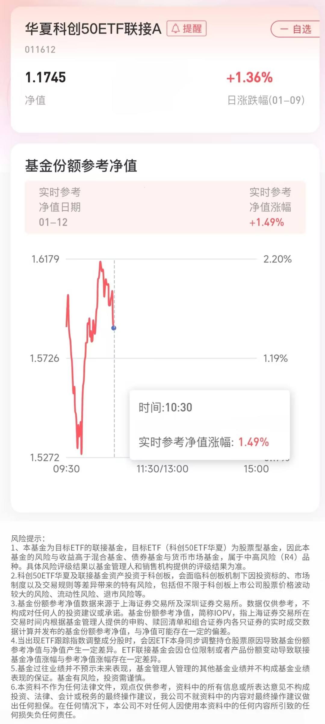 截止至2026年1月12日10:30,本基金跟踪目标基金的实时参考净值涨幅为1.49%,其跟踪的指数最新PB为6.68,处于较高区间。