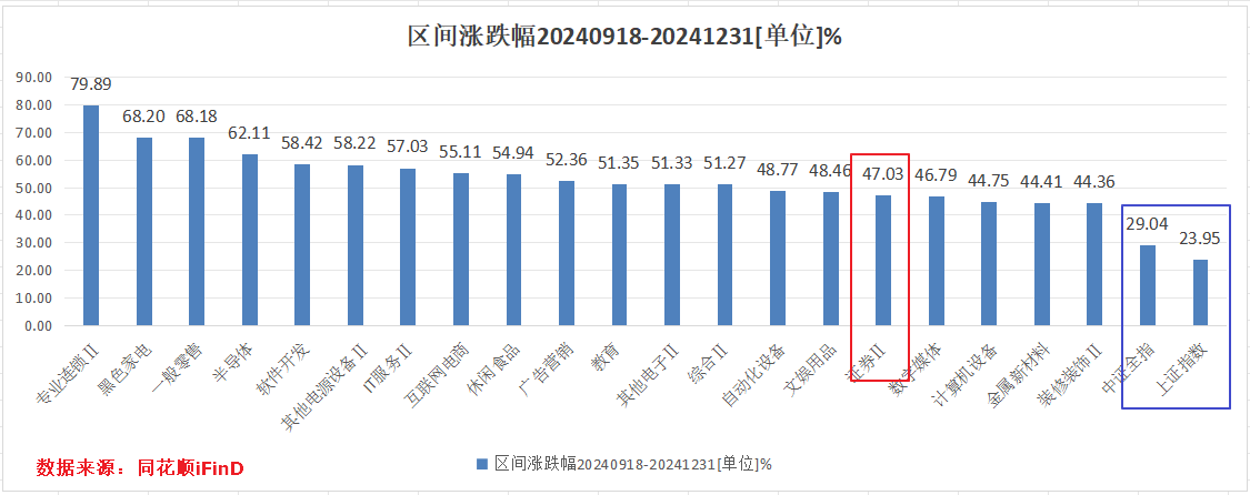 2024年“924”政策行情中券商板块已快速冲高,提前消化2025年业绩高增预期;2024年9月18日-2024年12月31日,申万证券指数涨幅47.03%,在124个申万二级行业中,排名第16位,大幅跑赢A股整体(中证全指)的29.04%和上证指数的23.95%涨幅。