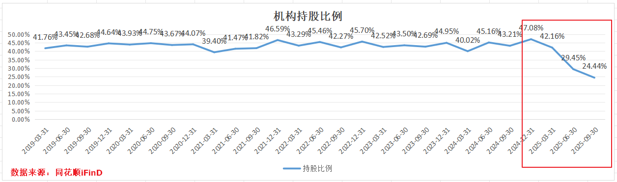 机构(一般法人、基金、券商)持仓一直在40%以上,但2025年机构持仓比例快速下降,2025年Q1、Q2、Q3机构持仓分别为42.16%、29.45%、24.44%,与2024年底的47.08%形成鲜明对比。
