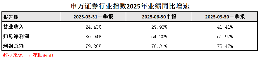 2025年前三个季度,申万证券行业(指数)利润总额同比增速超过70%,归母净利润同比增速超过60%。