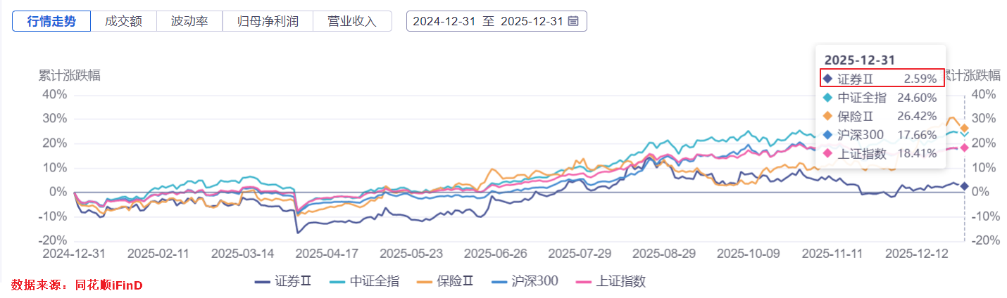 证券公司历来有“牛市旗手”之称,从来不缺席牛市,但2025年的表现却让人大跌眼镜。申万证券行业指数(801193.SL)2025年涨幅只有2.59%,跑输所有主要宽基指数,同期中证全指涨幅26.42%、上证指数涨幅18.41%、沪深300涨幅17.66%;与证券行业同为“非银金融”的保险行业,在2025年的涨幅高达26.42%,则恰好跟上了A股牛市的脚步(中证全指)。