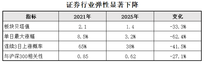 券商板块因权重高(约占沪深300指数 10%)、弹性大(历史贝塔值约 1.8-2.2),被赋予市场 “稳定器” 功能,而非传统的 “牛市旗手”: