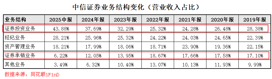自营业务(证券投资业务)占比逐年上升,营业收入占比从2019年的28.38%上升到2025年(中报)的43.88%;而投行业务(证券承销业务)占比则成下降趋势,营业收入占比从2019年的17.10%,下降到2025年(中报)的6.22%。