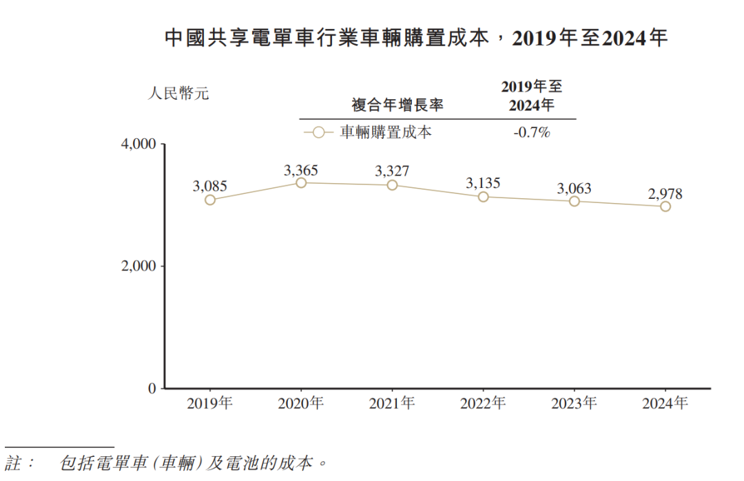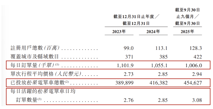 深入到业务层面,根据招股书数据,2025Q3公司单次行程价格为2.94元,同期松果电单车每日平均订单数量为3.08单,这意味着一辆活跃松果电单车一年能产生的收入预期为3305元(365天*2.94元*3.08单)。