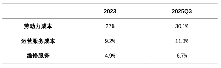 从成本结构来看,折旧的占比从2023年的41%下滑到2025Q3的29.1%。与此相对应的是,运营成本持续攀升,2023年到2025Q3占比变动如下表: