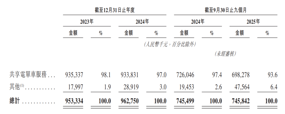 经营数据方面,截至2025年9月30日,松果在全国422个县市投放了454,627辆共享电单车,注册用户数已达1.28亿,规模相当可观。反映到收入上,松果的电单车业务在2024年实现收入9.34亿元,同比微降0.16%,同期收入占比约97%。