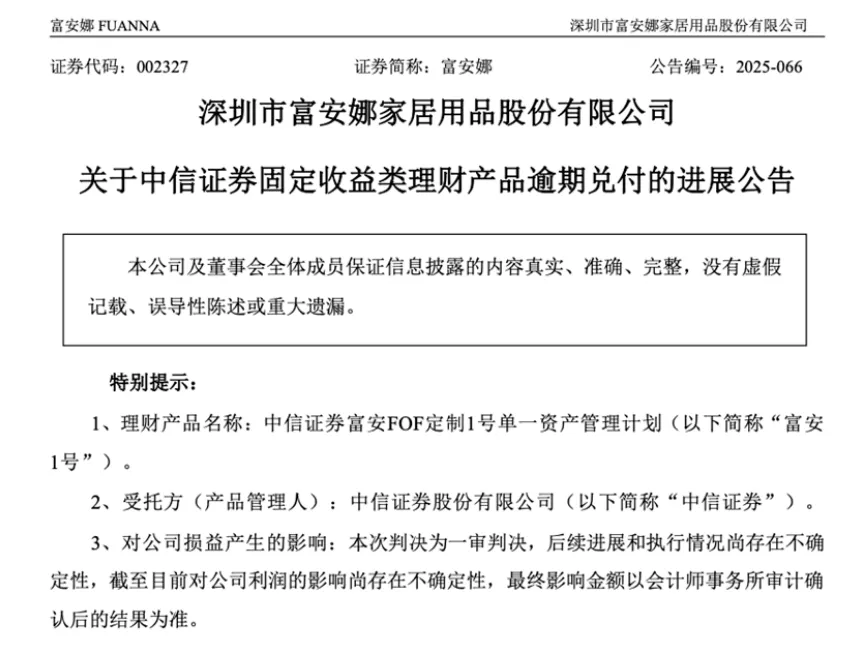 2025年底,家纺龙头富安娜公告披露,其与中信证券、招商银行广州分行之间的金融委托理财纠纷,迎来一审判决:中信证券需就部分本金损失承担赔偿责任,后续清算回款双方按比例分配;托管行不承担赔偿责任,仅履行配合义务。