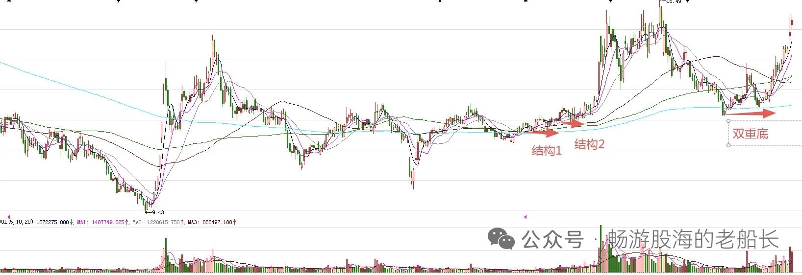 三安光电,周末分析中,指出了上周五的长上影线是仙人指路信号,今天就收回来了,基本验证了判断。最近两个交易日的K线,估计不少散户看了之后心中没底。实际上,个人认为这有助于股价继续上涨。分析方法,写在三部书稿中。周期面来看,今天是第三个有效周期,短线股价很容易继续上涨。同时,股价到了前期高点区域,这样的走势,已经说明股价比较强势了。 图中标注的结构1和结构2突破,意味着股价处在上涨趋势。此后的中期调整,是中长期筑底形态实现有效突破后的洗盘,直至双底形态突破,意味着中期调整结束。所以,波段上涨已经在进行中,接下来还会继续波段上涨。
