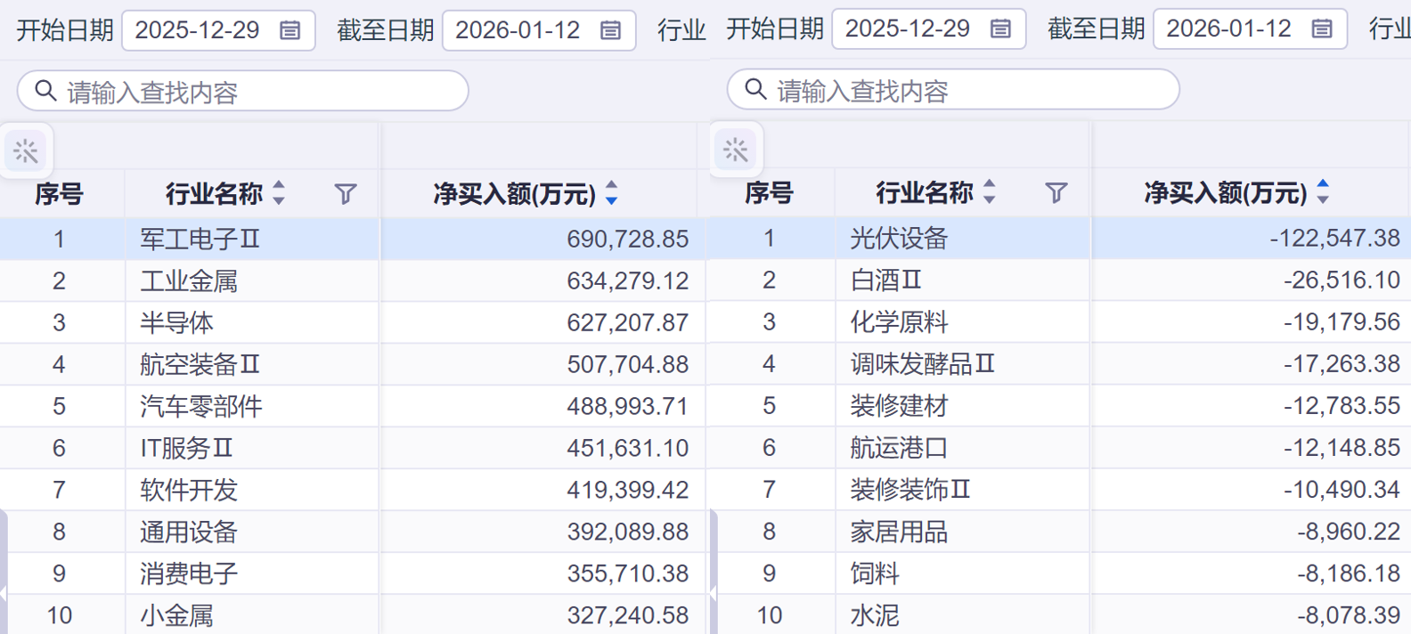 12月29以来的流入流出情况:基本也是热度最高的前五板块,趋势既可能延续,也可能某一天由盛转衰,需要持续观察。(军工电子、航空装备的金额在快速提升;光伏、白酒流出加速)