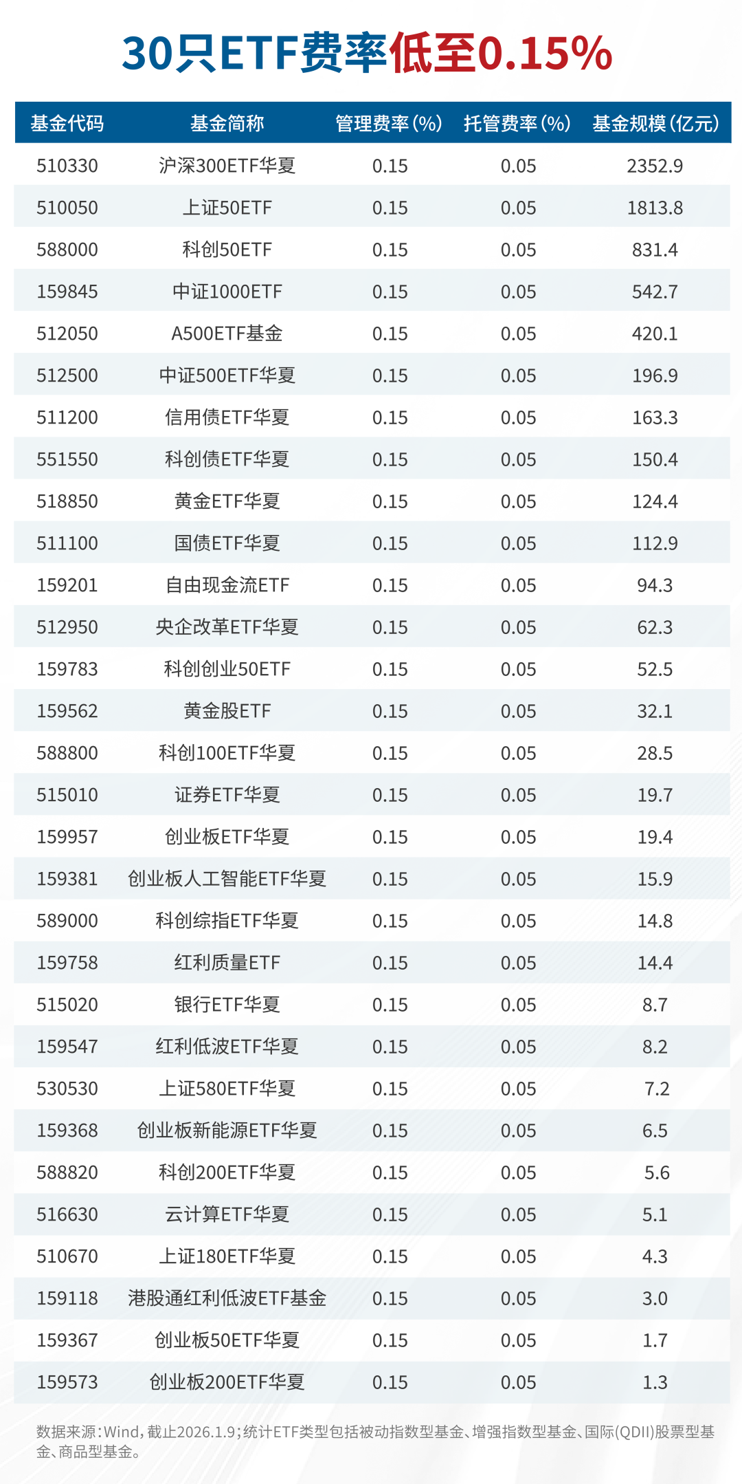 30只ETF管理费率为全市场同类最低档(0.15%/年),其中包含10只超百亿的ETF,合计规模超6700亿元,让利投资者“诚意十足”。 (数据来源:Wind,深交所、上交所,基金规模不代表业绩水平,不构成投资建议。)