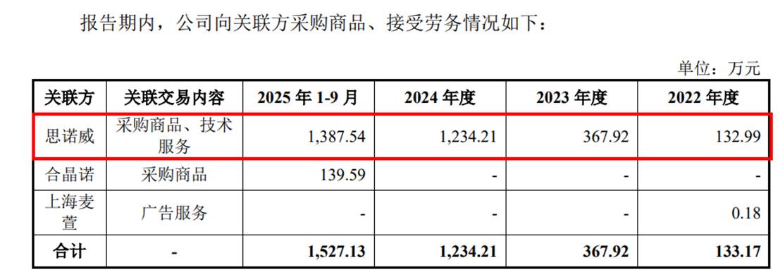 在高端测试设备领域,芯片设计能力往往是技术护城河的核心。然而,联讯仪器却将核心芯片研发业务外包给了关联方思诺威。2023年10月,联讯仪器投资思诺威,后者随即成为其关联方。此后,公司迅速将原本由子公司承担的自研芯片设计工作,转为委托思诺威完成,理由是“提升资源使用效率”。但数据显示,相关交易金额迅速膨胀:2022年向思诺威采购商品、技术服务132.99万元,到2025年9月末已飙升至1387.54万元。