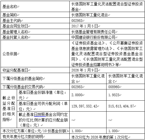 注:根据《长信国防军工量化灵活配置混合型证券投资基金基金合同》约定,本基金在符合基金有关分红条件的前提下可进行收益分配,基金收益分配后各类基金份额的份额净值不能低于面值;即基金收益分配基准日的各类基金份额的份额净值减去每单位该类基金份额收益分配金额后不能低于面值,本次分红方案符合合同约定。