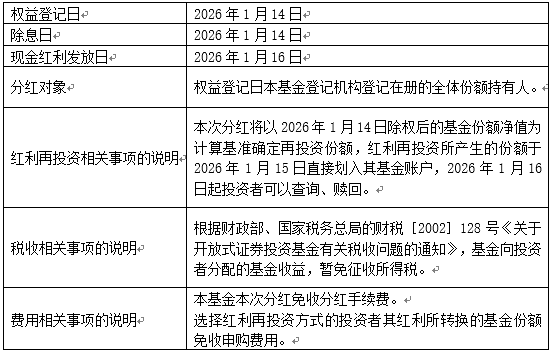 4、投资者可以在基金开放日的交易时间内到销售网点修改分红方式,本次分红确认的方式将按照投资者在权益登记日之前(权益登记日2026年1月14日申请设置的分红方式对当次分红无效)最后一次选择的分红方式为准。