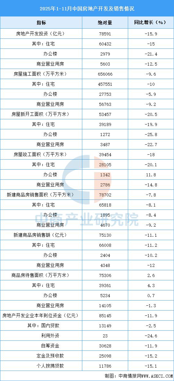 2025年1-11月,全国房地产市场整体仍处于调整阶段,主要指标呈现全面下行但初现企稳迹象的态势。具体来看,全国房地产开发投资78,591亿元,同比下降15.9%;房屋新开工面积和销售面积同比分别下降20.5%和7.8%,反映出市场信心仍待修复。值得关注的是,11月末商品房待售面积较10月末减少301万平方米,同时11月国房景气指数为91.90,虽仍处于较低景气区间,但部分核心城市的高端项目出现热销,表明市场在深度调整中正逐步探寻底部。