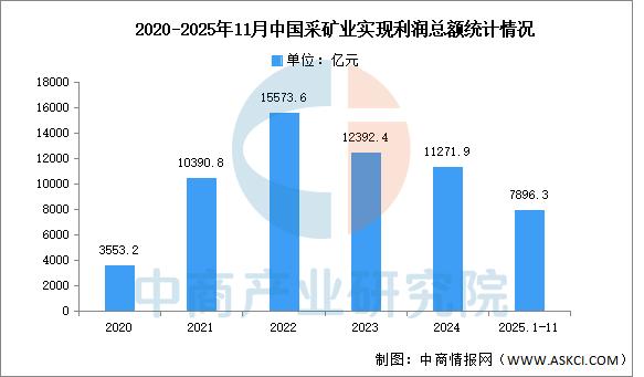 2025年1-11月份,中国采矿业实现利润总额7896.3亿元,同比下降27.2%。煤炭开采和洗选业实现利润总额2970.1亿元,同比下降47.3%。
