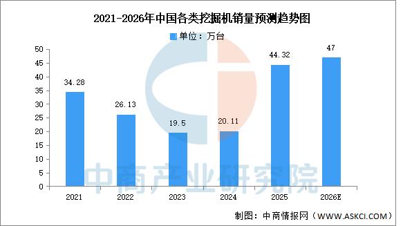 中商产业研究院发布的《2025-2030年中国工程机械市场需求预测及发展趋势前瞻报告》显示,2025年12月中国各类挖掘机销量约达2.31万台,同比增长19.2%。2025年1-12月中国各类挖掘机销量达44.32万台。中商产业研究院分析师预测,2026年预计保持增长至47万台。
