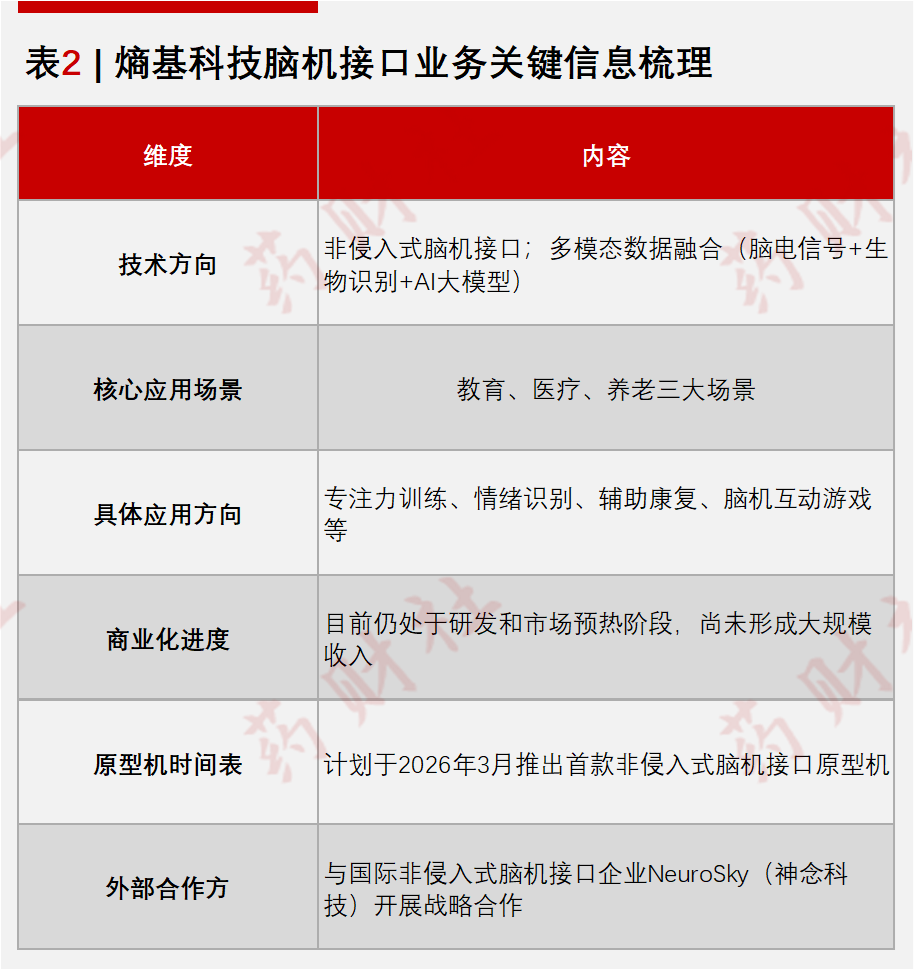 公司对外披露,脑机业务与国际非侵入式脑机接口巨头NeuroSky展开合作,计划于2026年3月推出非侵入式(non-invasive)脑机原型机,重点瞄准教育、医疗、养老三大应用场景,例如通过脑机互动游戏训练青少年专注力,或在康复和情绪识别中引入脑电信号分析。