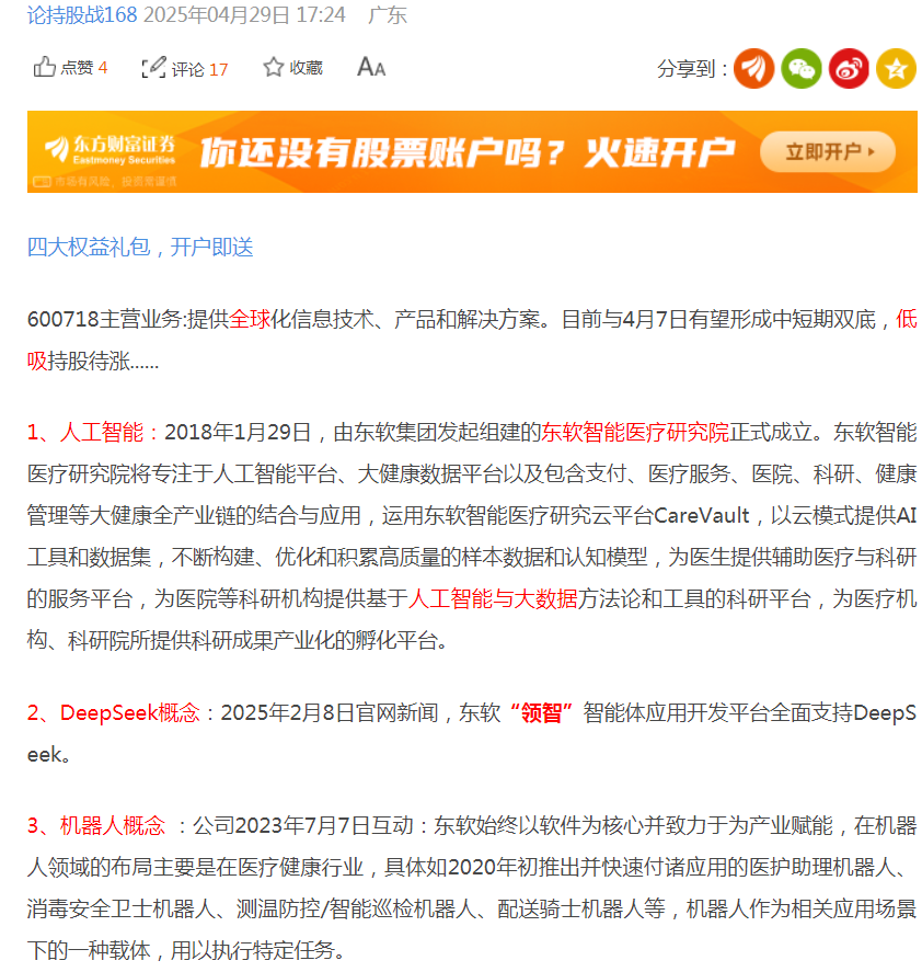 1、AI智能体 :2024年半年报:公司加强以 AI、大数据为代表的公司级共性基础技术研发,取得多项重要进展。公司积极推进与国产算力和 AI 生态适配,与合作伙伴共同推动“大模型智能体一体机” 的适配和测试,并在医疗、人社、医保 等典型行业进行验证和推广。 2024 年上半年,东软自研“领智” (IndustraMind)通用大语言模型并完成备案。