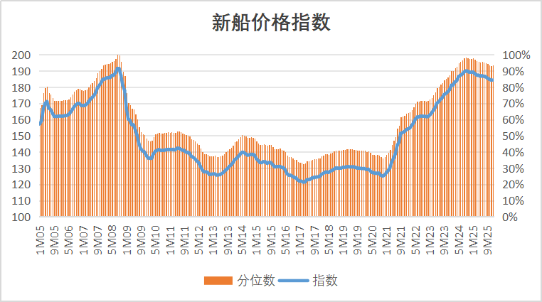 决定本轮周期质量一个关键的信号来自价格:尽管从全年总量看,全球新接订单较2024年的辉煌高点下降了约27%。但新船价格展现出稳定性,克拉克森新造船价格指数2025年仅微幅回调2.4%,年末依旧坚守在185点附近的历史高位,较2020年底的基数大幅上涨了47%,仍处于90%以上分位数。