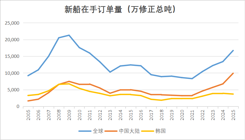2025年,全球新船手持订单量攀升至本轮周期的新高。饱满的订单簿与持续处于高位的产能利用率,共同构成了维系当前新船价格体系的核心前提。在这一坚实基础上,造船行业展现出强大的价格刚性。