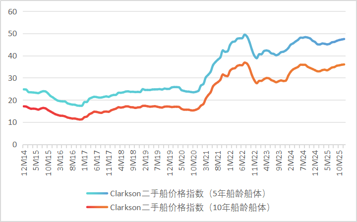 价格韧性在二手船交易市场中也得到了验证。2025年12月,反映资产价值的二手船价指数持续走强,其中10年船龄船体价格同比上涨8%,5年船龄船体同比上涨2%。其中散货船更为坚挺,二手船价同比上涨约4%。