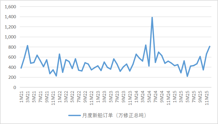 但真正的韧性在下半年,尤其是在年末得以显现。随着油运等细分市场运价回暖,以及地缘政治不确定性的边际淡化,被压抑的订单需求开始集中释放。2025年12月,全球新船订单量达到809万修正总吨,同比增长69%,环比增长23%,增速得到修复,呈现出强劲的反弹势头。